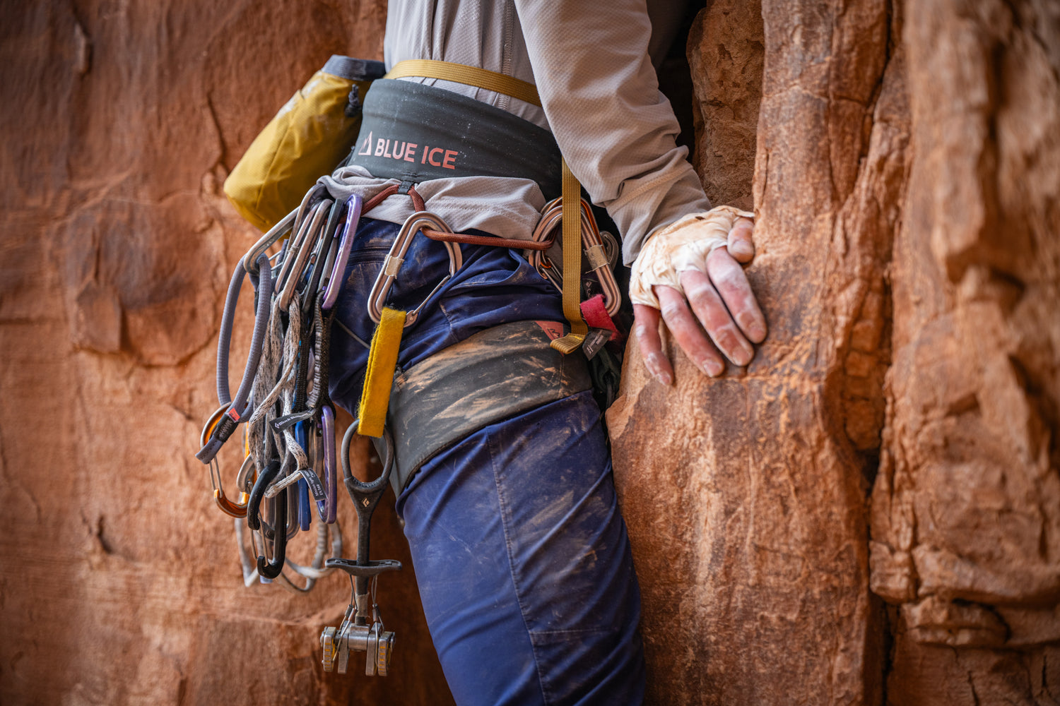 Größeres Chalkbag mit Gürtel aus Gurtband und sicherem Frontfach für Chalkbag.