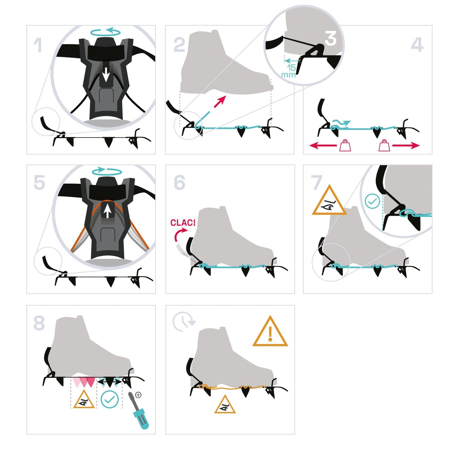 To ensure a good, tight to your boots, please follow our instructions for the first adjustment of the crampon: (1) Adjust the heel lever screw to its maximum open position. (2) Partially open the center strap webbing on the rear rail of your crampon (3) Adjust the center strap webbing so when you install it under the boot, the rear rail of the crampon comes short of the rear edge of the boot by ~15 mm (4) Lock the center strap webbing. Tension it firmly on both ends (5) Place the crampon on the boot and tighten the heel lever screw to a high level of tension when the heel lever is closed. (6) Lock the heel lever which must smack on the boot (7) Check that the back of the crampon does not protrude from the back of the boot (8) Adjust the middle rail according to your boot size (requires a screwdriver) (9) Fasten the ankle strap (10) Make sure all the parts are not loose (11) The crampon is ready to use! (12) The crampon is prone to lose some tension during the rst couple uses. Make sure to check it often during the first couple uses in the field and re-tighten it if necessary. The center strap webbing tension must be at its maximum every time you install the crampon on your boot